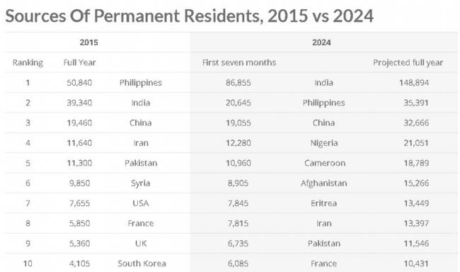 数据显示,根据2023年前七个月的趋势推算,印度移民人数迅速增加,预计到2024年底,来自印度的永久居民人数可能会达到148,894人。