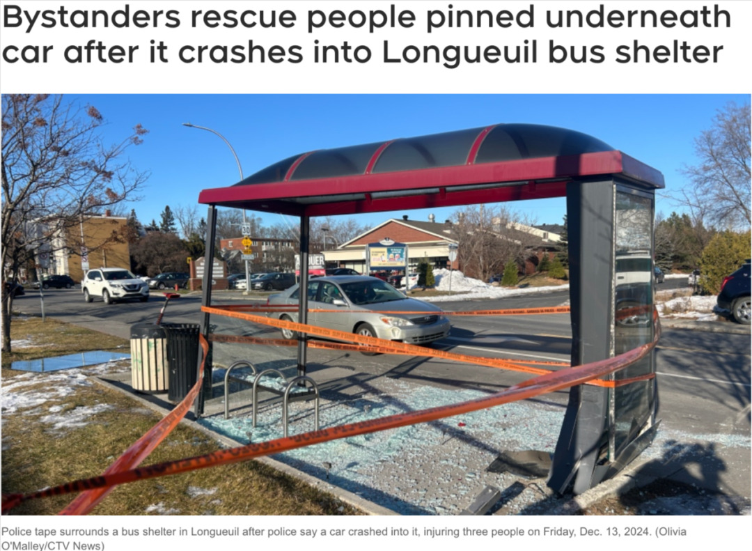 今天周五上午,在蒙特利尔南岸的Longueuil,一辆汽车冲撞了一个公交候车亭,两名女子被压在汽车底下,旁观者们迅速上前施以援手。