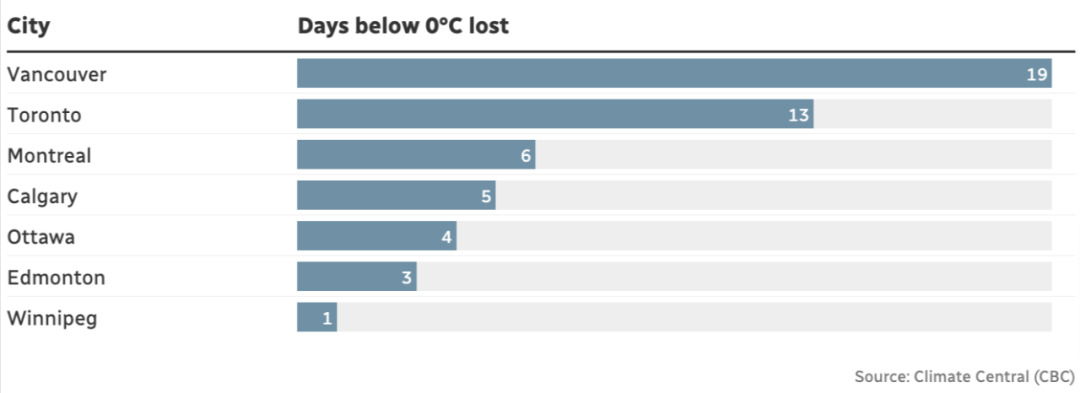 在加拿大,一些城市和地区的冬季天数减少超过两周,例如温哥华减少了19天,大纳奈莫地区减少了18天,而尼亚加拉地区则减少了15天。多伦多较之以往减少了13天,而蒙特利尔和以寒冷而闻名的卡尔加里每年则分别减少了6天和5天的零度以下天气。