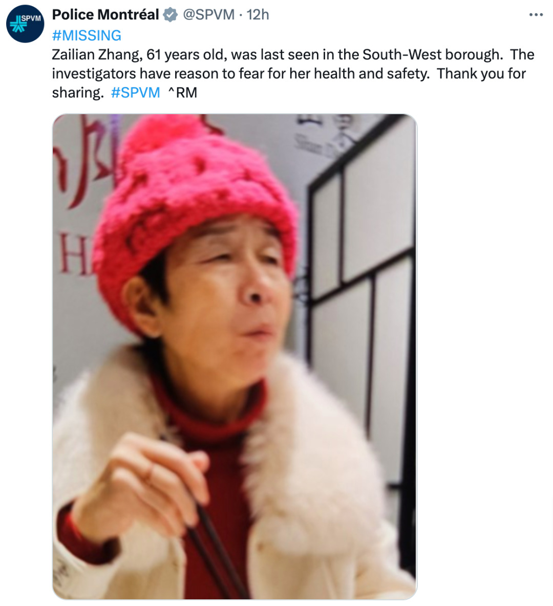 根据蒙特利尔市警(Service de police de la Ville de Montréal,SPVM)发布的消息,Zailian Zhang最后一次被目击是在周四,地点是她位于Sud-Ouest区的家中,此后便失联了。
