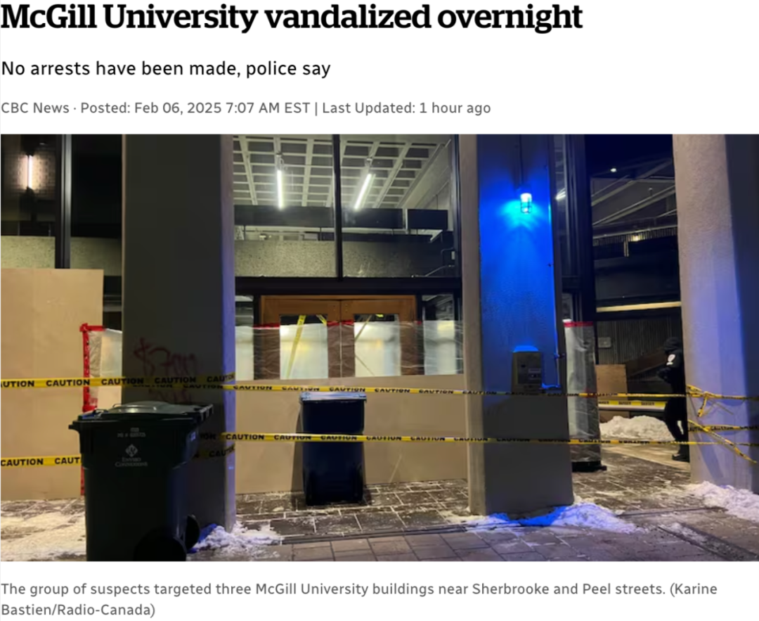 调查人员尚未查明事件原因,但在麦吉尔校园的Roddick门口,有人写下“自由巴勒斯坦”的字样。 据校方声明,破坏者的目标是五栋建筑,部分建筑当晚正在进行课程及考试。 校方表示,这次行为是为了“施压”学校改变其对以色列采取的抵制、撤资和制裁(BDS)政策的立场。 校方在声明中重申:“该大学对BDS的拒绝立场仍然明确且坚定。” 蒙特利尔警方正在调查目击者,并查看附近的监控录像,以寻找嫌疑人的身份线索。目前尚未有任何人被逮捕。 在过去两年中,麦吉尔大学成为了示威活动的焦点,部分抗议活动升级为与警方的冲突和破坏行为。