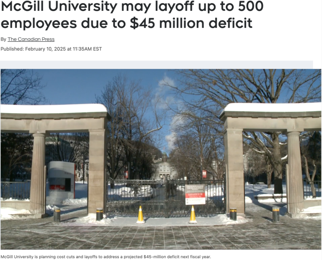 值得注意的是,麦吉尔大学并不是唯一面临财务危机的高等院校,全国各地的大学和学院也在报告类似的赤字情况,主要受到联邦政府于2024年1月首次实施的留学生数量限制政策的影响。Manfredi表示:“加拿大几乎所有高等院校都在面临预算赤字的问题。”