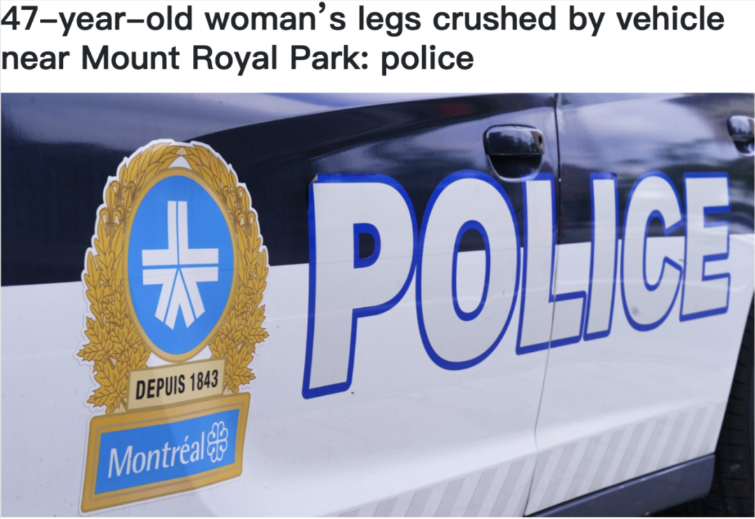 本周一,蒙特利尔皇家山公园附近发生一起严重交通事故,一名女子被疑似以超速行驶的汽车撞倒,目前她的伤势危急。