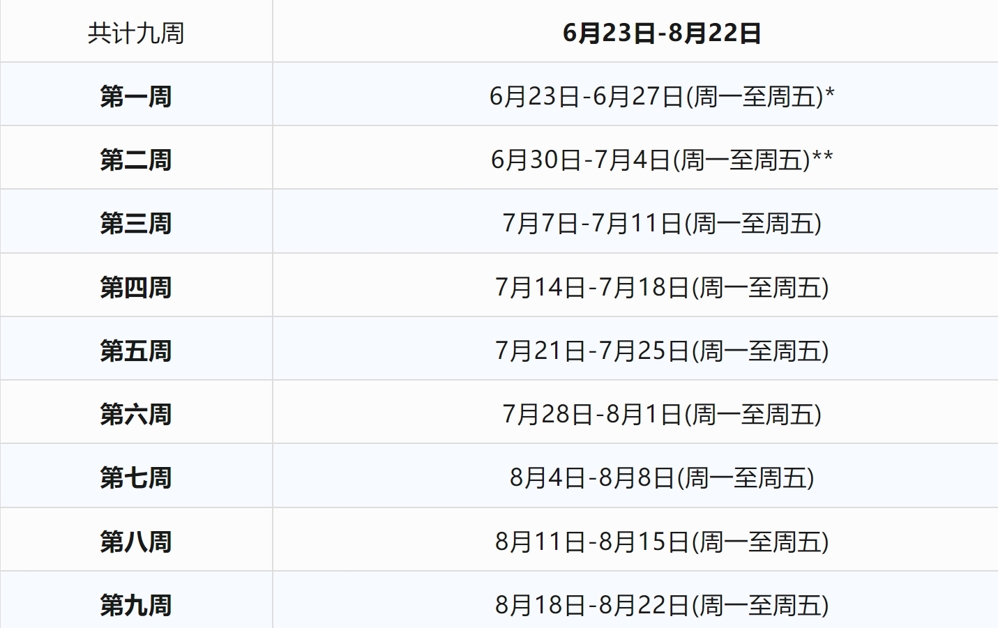 共9周, 每周15小时课程, 每天2节课, 每节课1,5小时;