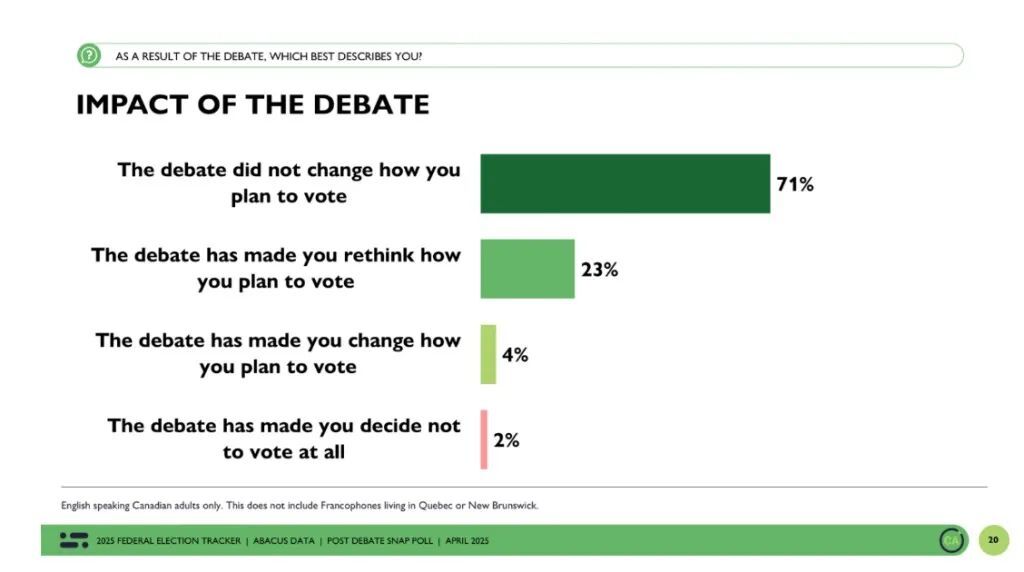 尽管在首场和周四进行的最后一场英语辩论中出现了激烈的口头攻击,许多针对自由党党领马克·卡尼(Mark Carney),但Abacus Data的辩论后民意调查结果表明,自由党和保守党都未能显著吸引选民支持。