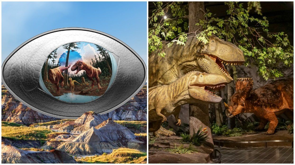 这款硬币由99.99%的纯银铸造,呈现出凸起、椭圆形的造型。在中央位置,一只色彩逼真的巨大眼睛格外醒目,周围则刻有细腻的鳞片纹理,模拟出恐龙皮肤的质感。据皇家造币厂介绍,这个设计意图展现当恐龙在白垩纪时期的加拿大荒野中漫游时所看到的景象——背景中点缀着其它恐龙和湿地森林,构建出一段古老而神秘的景观。