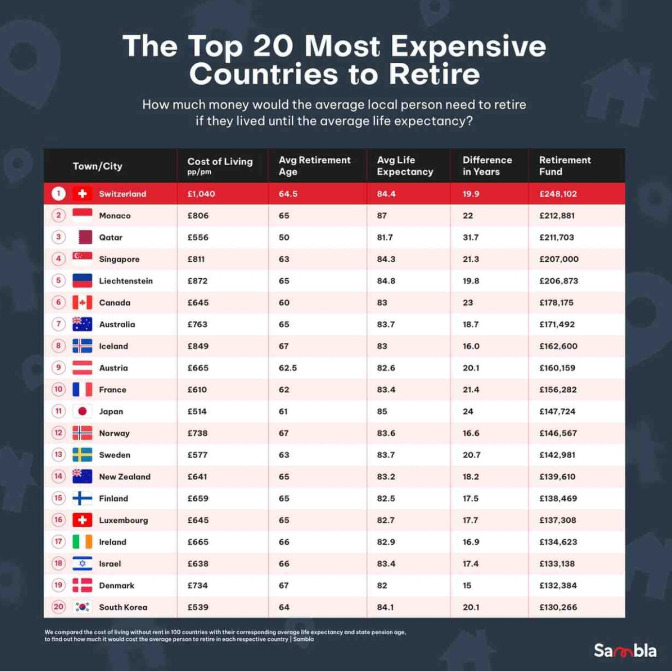 根据Sambla的信息,瑞士的生活成本为1,040英镑(1,847加元),居民需要约248,102英镑(440,511加元)来实现退休金。