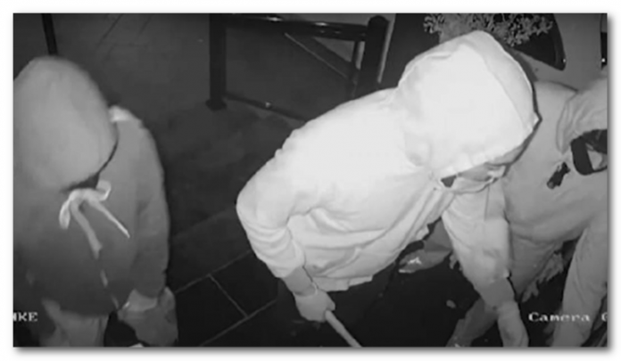 在警方提供的视频中,三名嫌疑人从车辆中出口,走向住宅前门。其中一名嫌疑人手持锤子,似乎用其砸碎了前门的玻璃,随后他爬过开口,让另外两名嫌疑人进入屋内。