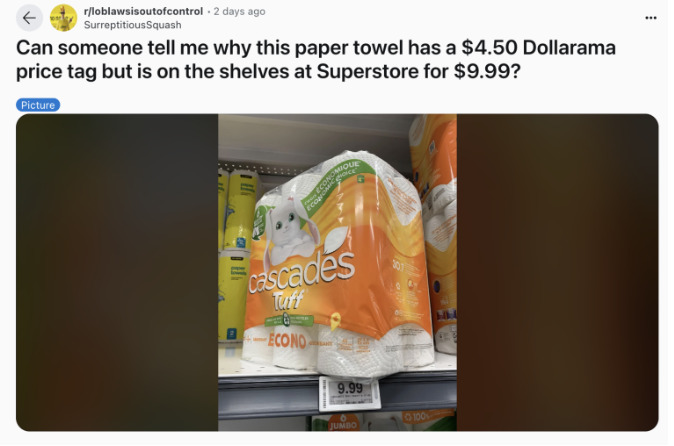 网友在帖子中提出了一个疑问:“为什么纸巾在Dollarama的售价是4.50,加拿大Superstore却标价9.99加元?”