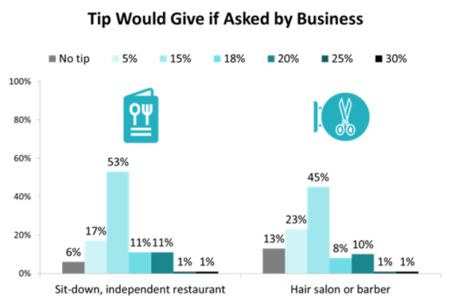 调查还表明,“在餐馆,支付15%小费的情况比在美容院或理发店更为普遍,比例分别为53%对45%。”