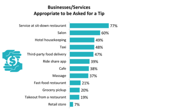 当谈到那些被认为不宜要求小费的场所时,外卖餐厅(19%)、杂货店(20%)和快餐店(21%)排名靠前。