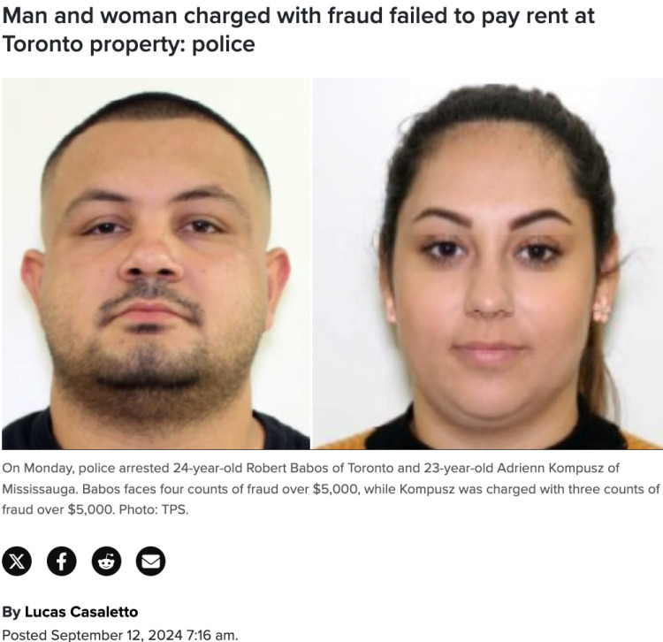 在本周一(9月9日),加拿大警察成功逮捕了这两名租户,他们分别是24岁的加拿大居民Robert Babos及23岁的密西沙加居民Adrienn Kompusz。